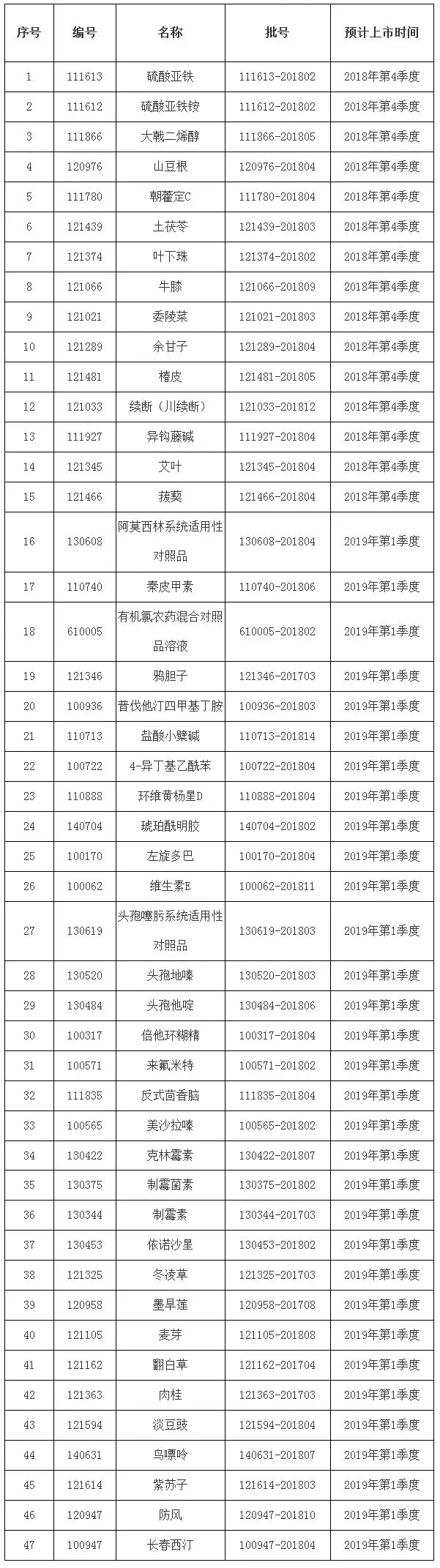? ? 2018年第十一期國家藥品標準物質供應新情況,包括47個即將換批品種的預計上市時間、47個即將失效品種的有效使用期限和2個停用品種名單。 即將換批的品種 即將失效的品種 近期停用的品種 ? ?對于有效使用期限外的標準物質以及未規定有效使用期限的非最新批次標準物質(一般指在國家藥品標準物質供應目錄中不收載的老舊批次),中檢院將不再對其進行質量監測,用戶如若繼續使用,其特性量值及適用性請自行驗證